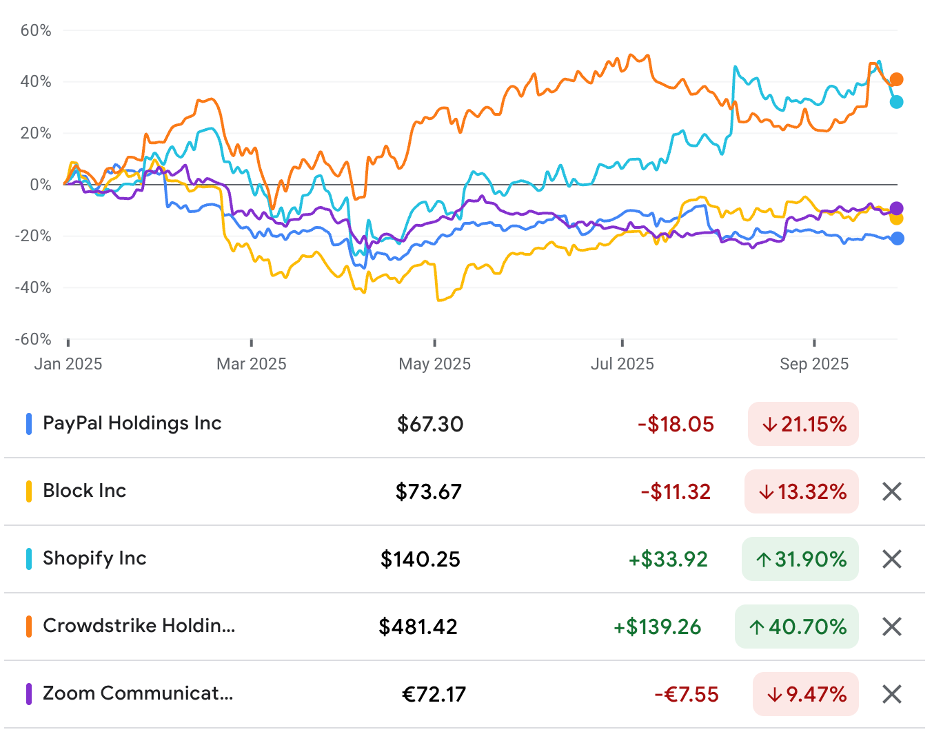 Okay, so it’s mixed signals. Some have done incredibly well, but others are doing just as badly as the SaaS laggards. I could only fit five tickers in the chart, but Twilio and DocuSign have taken a beating, too.